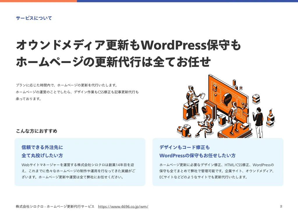 弊社の提供するサービスについて内容や特長を分かりやすくまとめた資料を無料でご覧いただけます。サービスの概要や支援内容を把握するための資料としてご活用ください。 ホームページ更新代行サービス資料 ホームページ更新代行サービスの資料です。サービスの詳細と事例が掲載されています。